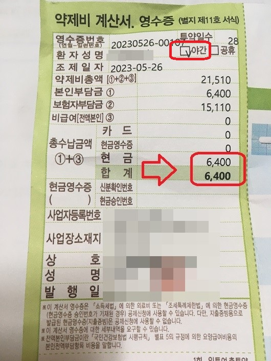 *. 병원 진료 시간 기준이 아니라 약국에서 처방전을 제출하는 시간 기준으로 조제료 할증이 적용된다. 평일 낮에 진료를 받아도 오후 6시 이후에 약국에 처방전을 제출하면 조제료가 할증이 되는 것이다.